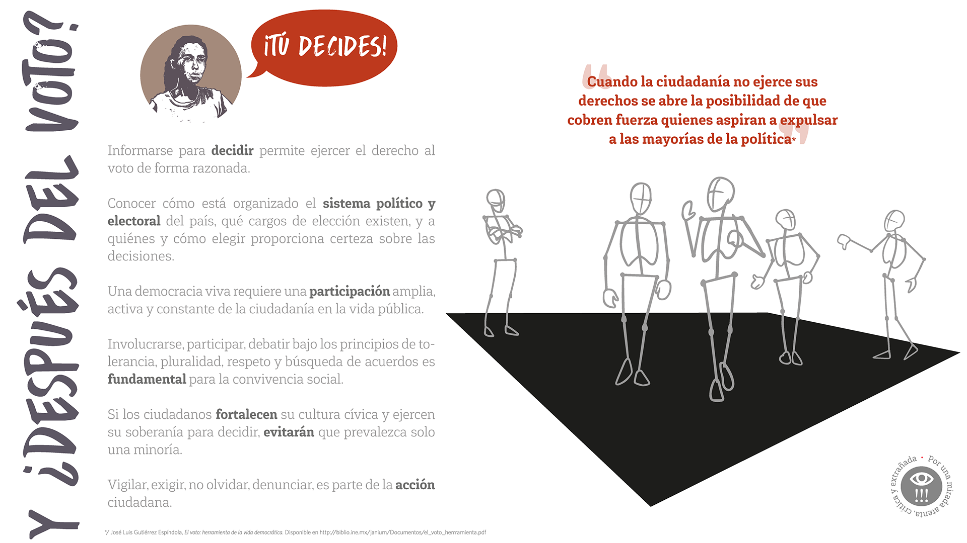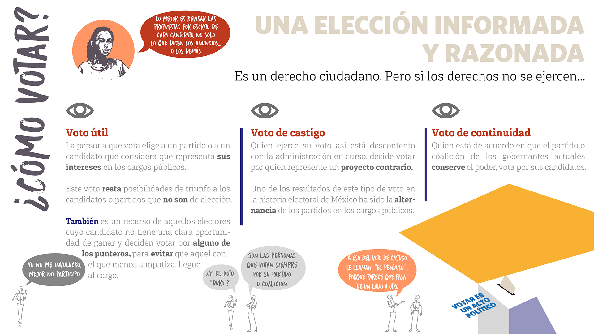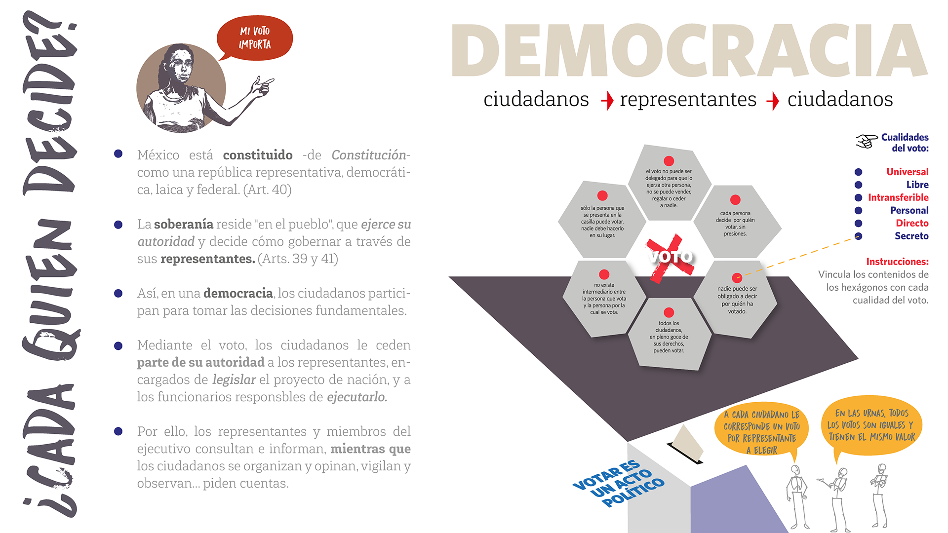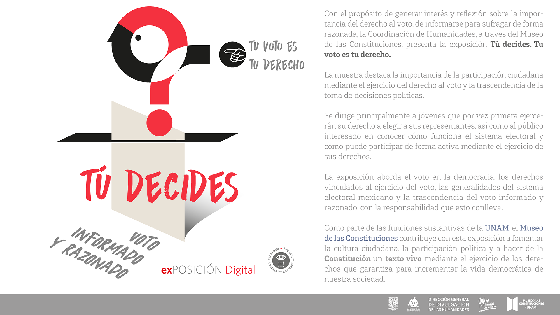 En 2018, el Museo de las Constituciones presentó la exposición temporal “¡Tú decides!, tu voto es tu derecho” para promover los derechos político-electorales de la ciudadanía. Hemos preparado esta exposición en formato digital y actualizado contenidos para que cumpla su cometido en este año 2024 en el que se realizará el proceso electoral más grande en el país, incluyendo, nuevamente, la elección de la persona titular de la Presidencia de la República.