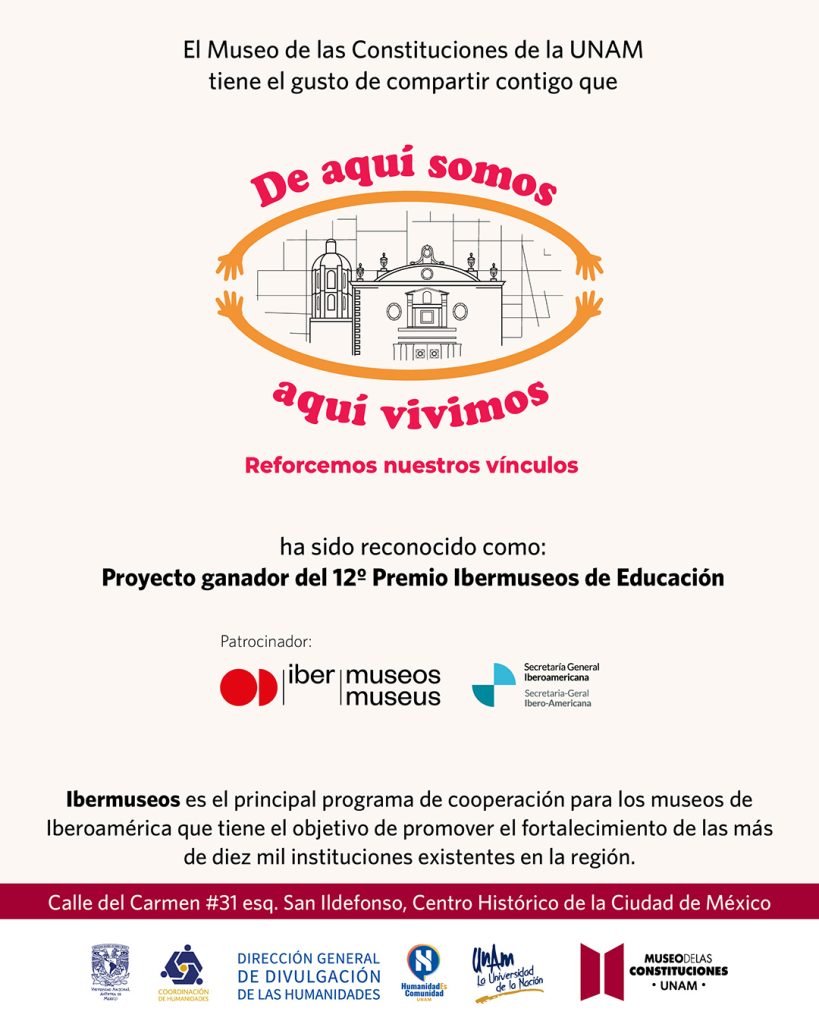 El proyecto De aquí somos, aquí vivimos. Reforcemos nuestros vínculosdel Museo de las Constituciones (MuCo) de la Universidad Nacional Autónoma de México tiene entre sus objetivos favorecer los procesos de activación de dinámicas comunitarias para fortalecer la convivencia en el barrio del Centro Histórico de la Ciudad de México y posicionar al Museo como un punto de encuentro y acción. Promoverá también la transformación de las tendencias de aislamiento que produce la actividad socio-económica de la zona del Centro Histórico para inspirar a vecinas y vecinos a reconstruir comunidad donde el MuCo se convierta en un punto de encuentro para la convivencia segura y respetuosa, la adquisición de nuevos saberes, y el desarrollo de la creatividad y el entretenimiento.